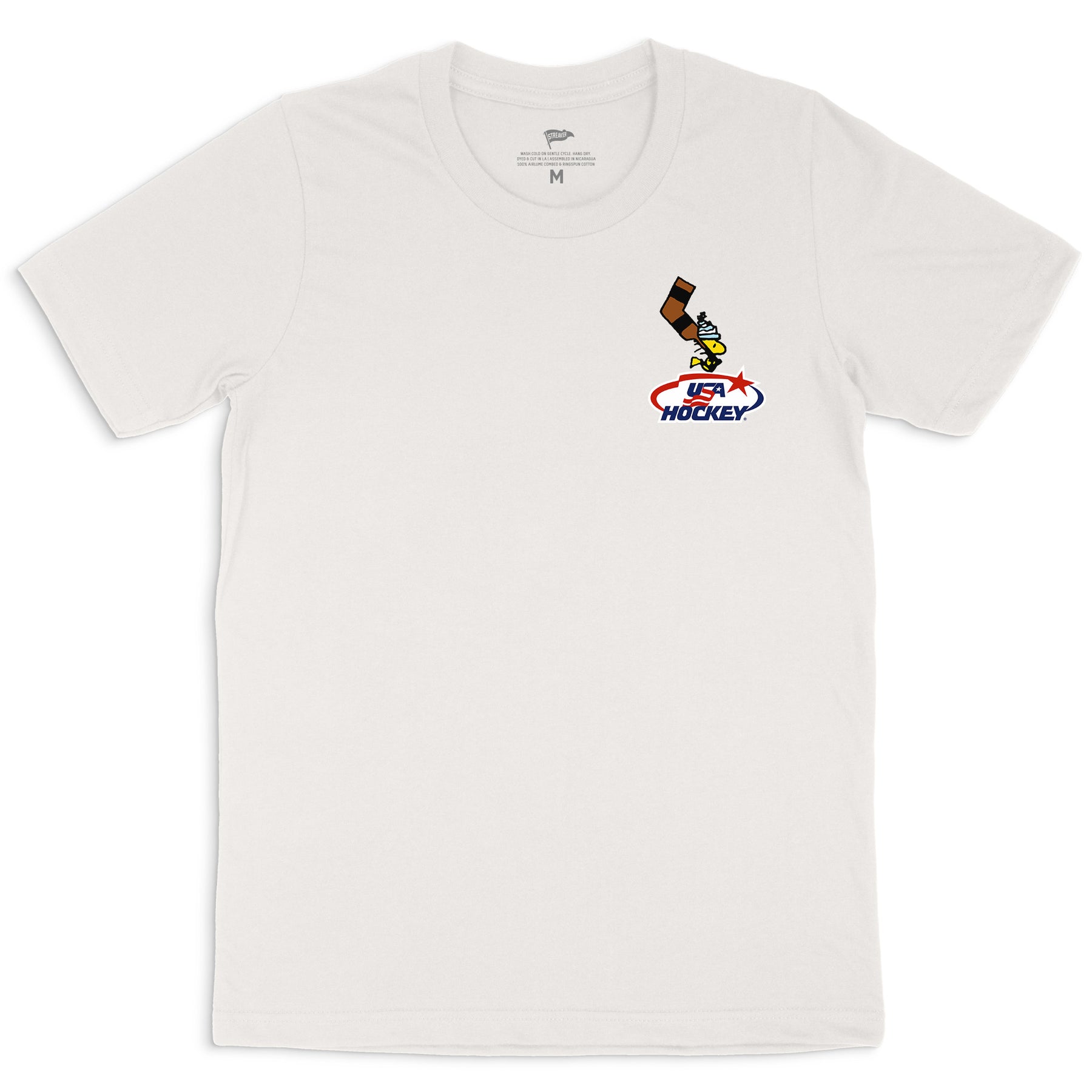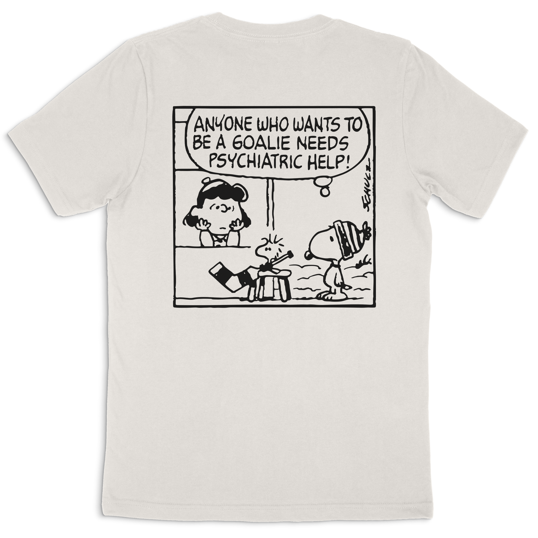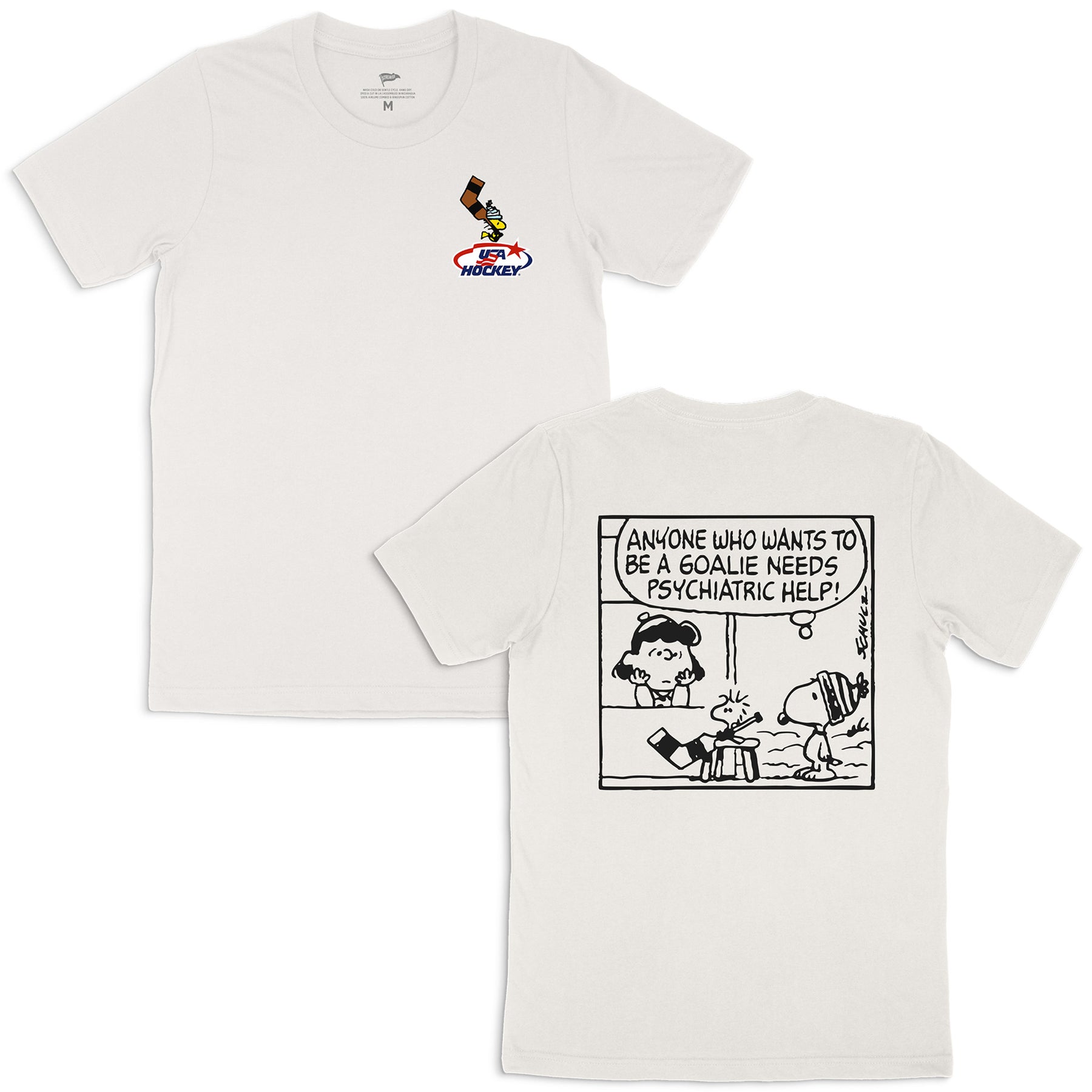 Part of our exclusive capsule with Peanuts and USA Hockey, our tee features Woodstock at Lucy's psychiatry booth seeking help because he wants to be a goalie.