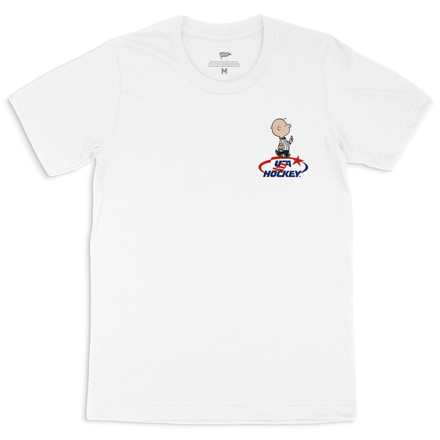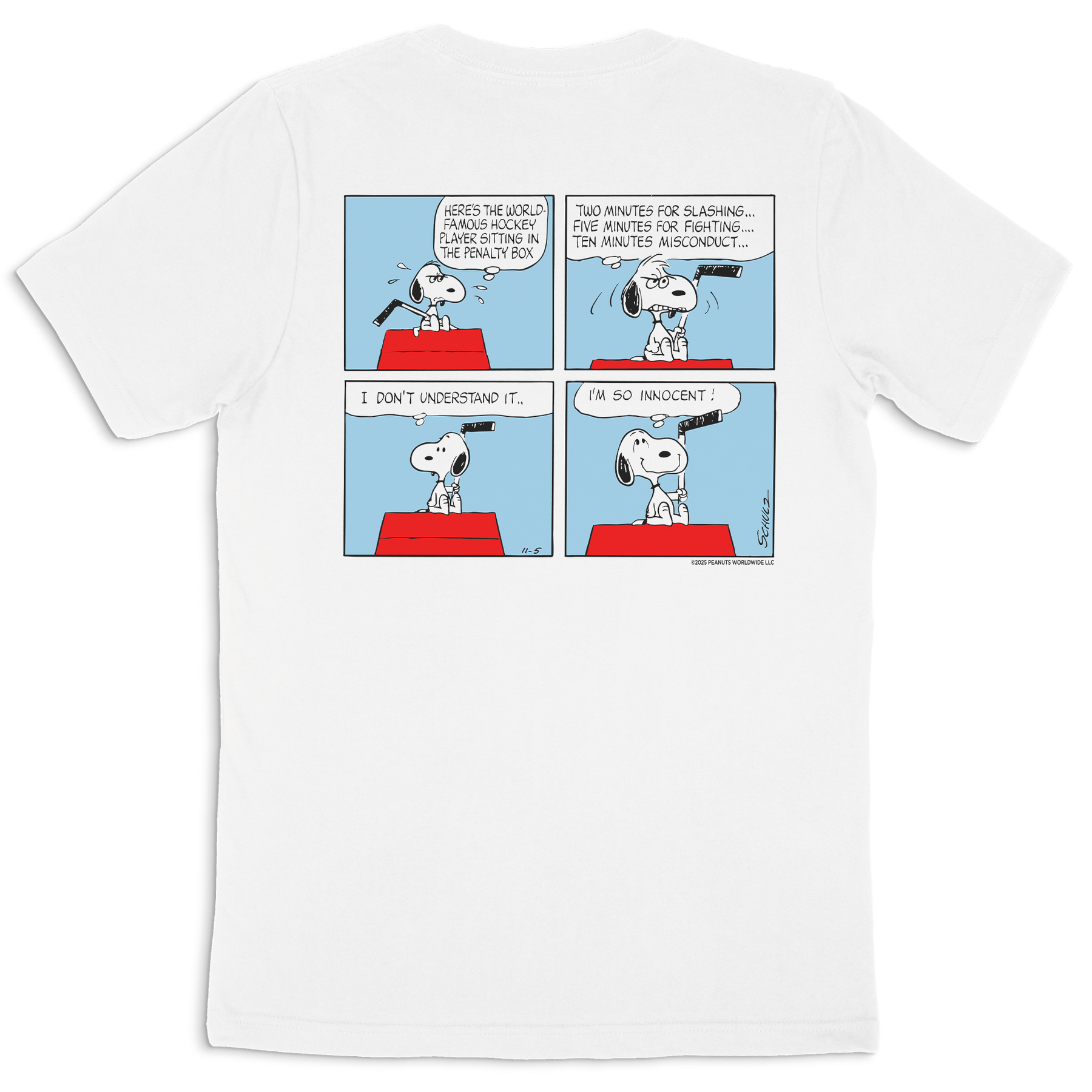 Part of our exclusive capsule with Peanuts and USA Hockey, our tee features a strip from November 5th, 1969 featuring Snoopy as the World Famous Hockey Player serving time in the penalty box.