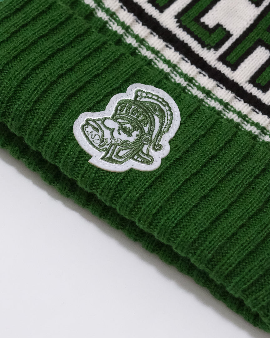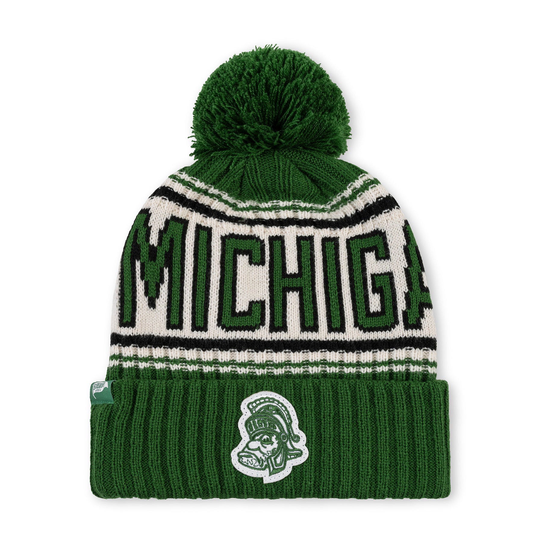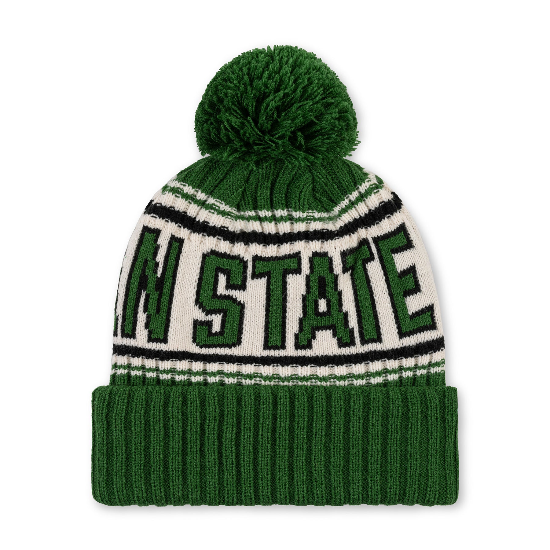 Our ultra-plush rib knit pom hat features MSU's throwback Gruff Sparty logo as an embroidered felt patch with a vintage-inspired striped body pattern and colorway.