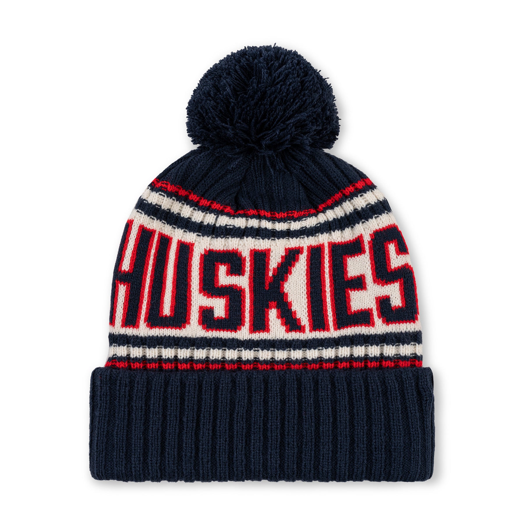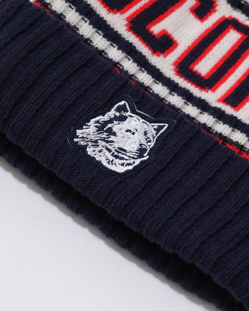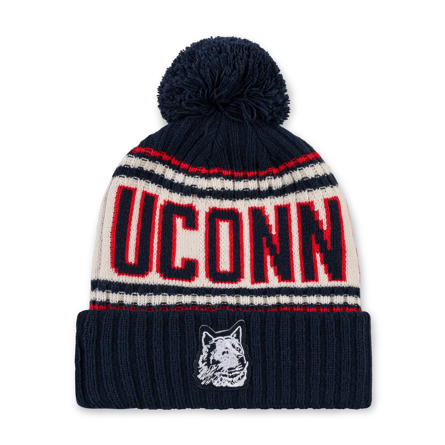 Our ultra-plush rib knit pom hat features UConn's 1970s-era husky logo as an embroidered felt patch with a vintage-inspired striped body pattern and colorway.